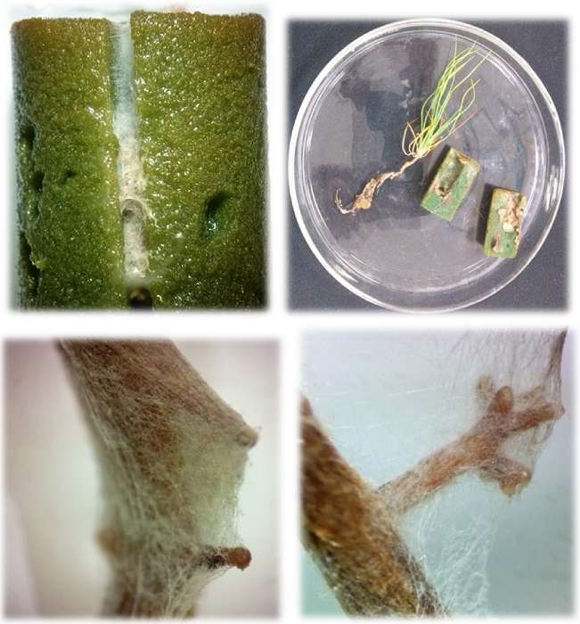 En condiciones de esterilidad, los micelios se filtraron del medio líquido, fragmentándolos en tamaño similar al del sistema radicular de las plántulas, para que lo cubriera por completo. Para realizar la inoculación in vitro, se utilizaron piezas cilíndricas del material conocido como espuma agrícola hidropónica o “peat foam”. Dichas piezas, de 4 cm de altura por 2 cm de diámetro, se obtuvieron con ayuda de un sacabocados metálico. Obtenidos los cilindros principales, con otro sacabocados más pequeño de 5 mm de diámetro, se extrajeron alrededor de 3 cm de altura de peat foam de la parte central del cilindro, para facilitar el acomodo del sistema radicular de la plántula y favorecer que el fragmento de micelio quedase completamente en contacto con la raíz.