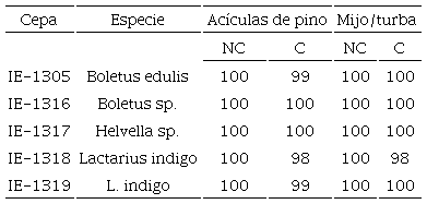 Los vectores utilizados para la congelación de las cepas fueron semillas de mijo (Panicum miliaceum L.) y acículas de pino, estas últimas colectadas en la región boscosa donde se colectaron los especímenes de hongos. Las acículas se cortaron en fragmentos de 1 cm de largo. Ambos vectores se lavaron con agua corriente y se mantuvieron en remojo, por separado, durante 12 h. Posteriormente, se colocaron en agua caliente (65 °C) durante 15 min para favorecer su reblandecimiento y se escurrieron para drenar el exceso de humedad. A las semillas de mijo se les adicionó 0.5% (peso seco) de una mezcla 1:1 de CaCO3 y CaSO4 además de 2.5% de turba. Los vectores se colocaron en bolsas de polipropileno y se esterilizaron en autoclave a 121 °C durante 90 min. Después de enfriarse, se colocaron 15 g de cada sustrato en cajas de Petri estériles de 60 mm de diámetro, que se inocularon con un disco de micelio (± 0.5 cm de diámetro) de cada cepa precultivada en PDA. Las muestras se incubaron en condiciones de oscuridad a 21 °C ± 1 ºC para permitir que el micelio cubriera a los vectores estériles contenidos en las cajas de Petri, aproximadamente 15 días a 30 días de incubación.