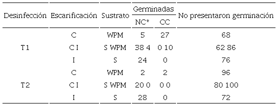 En la Tabla 2 se muestran los porcentajes de germinación, contaminación y ausencia de crecimiento que se obtuvieron con los diferentes tratamientos de desinfección, escarificación y tipos de sustratos de germinación utilizados. En general, se obtuvo un mayor porcentaje de germinación en el tratamiento T1 de desinfección. Por otra parte, en todos los casos, independientemente del tratamiento utilizado, se obtuvo un mayor porcentaje de germinación cuando se utilizó el sustrato a base de tierra, lombricomposta y tepetzil (S), ya que el mayor porcentaje de contaminación se observó en las muestras en las que se utilizó el medio WPM.