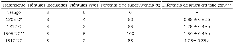 En cuanto a la micorrización de las plántulas, no se observó sobrevivencia en los individuos de Pinus montezumae incubados sin micelio, mientras que en las plántulas inoculadas con micelios criogenizados se alcanzó un porcentaje de sobrevivencia de 33% (IE-1317) a 50% (IE-1305), mientras que en los micelios no criogenizados los porcentajes de sobrevivencia fluctuaron entre 33% (IE1317) y 100% (IE-1305). El promedio de altura de los tallos de las plántulas micorrizadas varió entre 0.95 cm (IE-1305 criogenizada) y 1.75 cm (IE-1317 criogenizada). Las variaciones encontradas en la altura de las plántulas no permitieron establecer diferencias estadísticamente significativas (p= 0.05) entre los tratamientos de criogenización (Tabla 3).