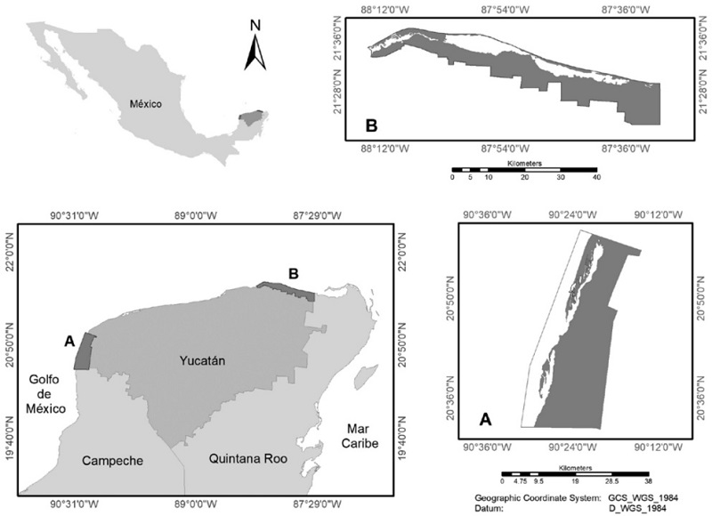 La RBRC y RBRL (Fig. 1) se encuentran en la provincia biogeográfica Yucatán (Comisión Nacional para el Conocimiento y Uso de la Biodiversidad [Conabio], 1997), dentro de la región hidrológica prioritaria 102 “Anillo de cenotes” (Arriaga et al., 2002); en las regiones marinas prioritarias 60 “Champotón - El Palmar” y 62 “Dzilam-Contoy” (Arriaga et al., 1998); y en las regiones terrestres prioritarias 145 “Petenes-Ría Celestún” y 146 “Dzilam - Ría Lagartos - Yum Balam” (Arriaga et al., 2000).