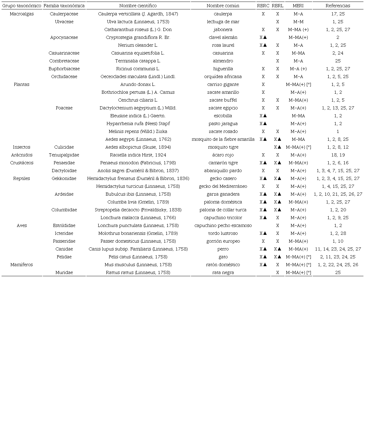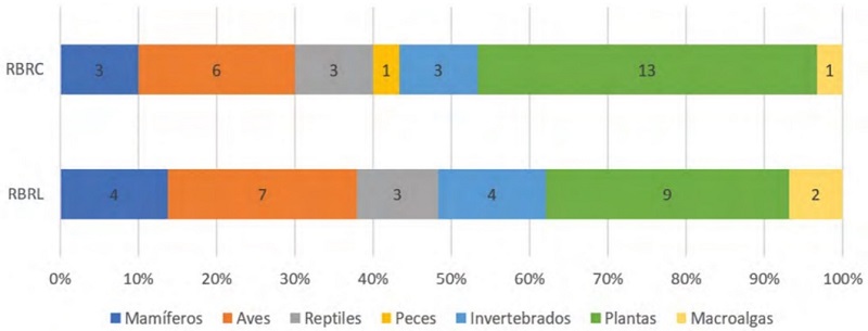 Derivado del análisis de la información, se determinó la presencia de 35 EEI en ambas ANP (Tabla 1), de las cuales, 30 corresponden a la RBRC y 29 a la RBRL, estas se ordenaron en siete grupos taxonómicos: mamíferos (4 especies); aves (7); reptiles (3); peces (1); invertebrados (4); plantas (14) y macroalgas (2) (Fig. 2).
