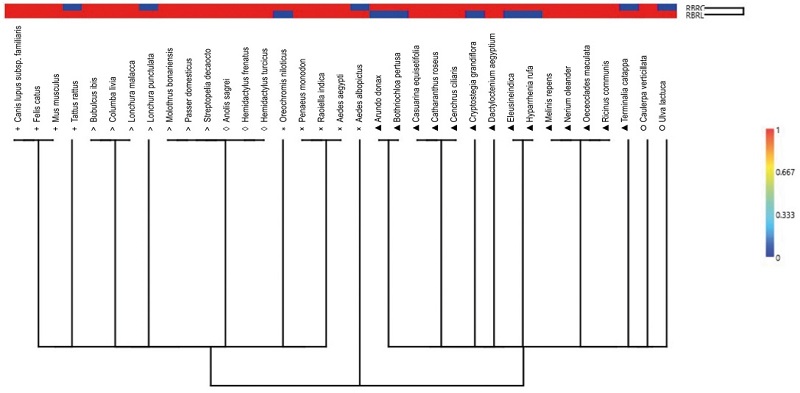 Pese a que la RBRC y la RBRL se encuentran en litorales opuestos en el estado de Yucatán, se identificó una similitud de 0.68 de acuerdo con el índice de Jaccard (Fig. 3). La similitud por grupo taxonómico correspondió a: 0.75 mamíferos; 0.85 aves; 1.0 reptiles; 0 peces; 0.75 invertebrados; 0.57 plantas y 0.5 macroalgas. Por lo que se sugiere una distribución generalizada en la mayoría de los grupos en la región costera del estado de Yucatán y/o vías de introducción similares.