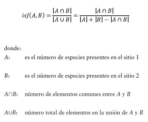 El resultado del índice de Jaccard varía entre 0 y 1. Un valor de 0 indica que no hay especies en común, mientras que un valor de 1 indica que los sitios tienen máxima similitud en composición de especies.