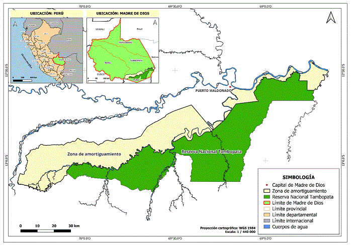 El área de estudio se localiza en el departamento de Madre de Dios, específicamente en la Amazonía suroeste en Perú, y está delimitada por las coordenadas geográficas 12° 9' 14,04" a 13° 24' 46,08" de latitud sur y 68° 34' 55,92" a 70° 25' 9,84" de longitud oeste (Fig. 1). La reserva nacional Tambopata (RNT) posee una zona de amortiguamiento que tiene un área de 231 719,17 ha, y se caracteriza por poseer un clima tropical húmedo, con una temperatura promedio mensual de 26 °C y precipitaciones anuales que superan los 1000 mm (Portal-Cahuana et al., 2023).