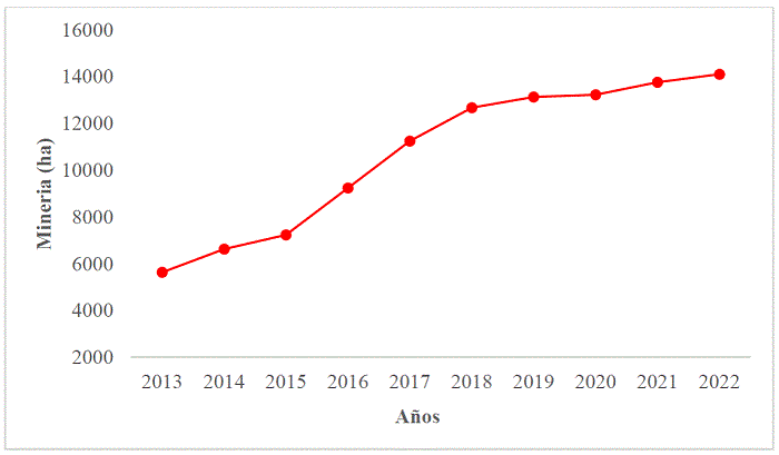 Minería. En la Figura 2 se observa que la clase “minería” como actividad antrópica principal en la zona de amortiguamiento de la RNT exhibe una “fuerte tendencia” de aumento de la deforestación, es decir, la pérdida de cobertura forestal fue de 2,5 veces desde el 2013 (5642,15 ha) con relación al 2022 (14 112 ha).