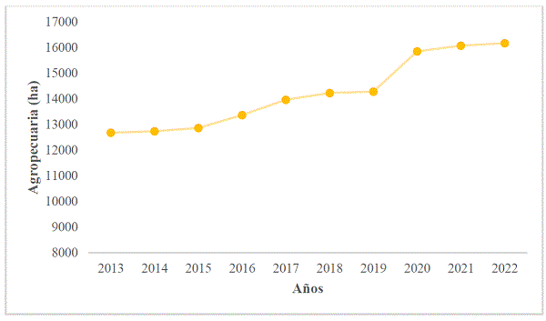 Agropecuaria. En la Figura 3 se muestra que la clase “agropecuaria”, como actividad antrópica, presenta una “leve tendencia” de aumento de la deforestación desde el 2013 hasta el 2022, con una pérdida de cobertura forestal de 3488,62 ha en el periodo analizado, además de ser la segunda actividad que mayor deforestación generó.