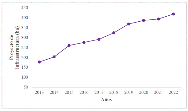 Proyectos de infraestructura. Los resultados muestran que la actividad de proyectos de infraestructura (Fig. 4) presentó una tasa anual de deforestación de 241,98 ha entre 2013 (176,77 ha) y 2022 (418,75 ha), representando un aumento de 136,89%.