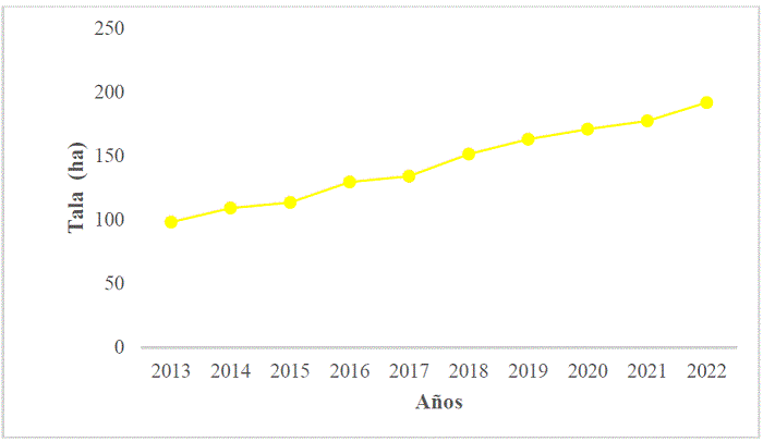 Tala. En la Figura 5 se observa que la clase “tala” mostró una pérdida de la cobertura forestal de 93,74 ha para el período de 2013 a 2022, indicando un aumento de 95,43% de la tasa de deforestación.
