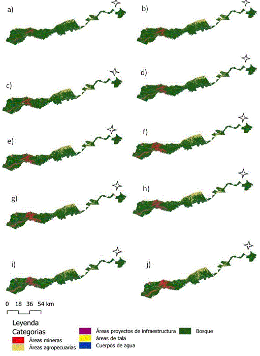 Las clases de entrenamiento que se identificaron como deforestación fueron: minería, agropecuaria, proyectos de infraestructura y tala, sumándose de forma separada las clases de cuerpos de agua y bosque. En ese contexto, la clase “minería” se refiere a las actividades antrópicas generadas por la minería aluvial aurífera que se desarrolla en los cauces y riberas de los ríos. La clase “agropecuaria” hace hincapié en las actividades de la agricultura y ganadería que se desarrollan, por lo general, en las márgenes de la carreteras principales y secundaria del área de estudio. La clase de “proyectos de infraestructura” abarca vías principales y secundarias como carreteras, así como la instalación y ruta de líneas de tensión. En el caso de la clase “tala”, se consideraron solamente aquellos lugares como suelos sin vegetación que se ubicaban dentro de territorios indígenas y que formaban parte de la zona de amortiguamiento de la RNT.
