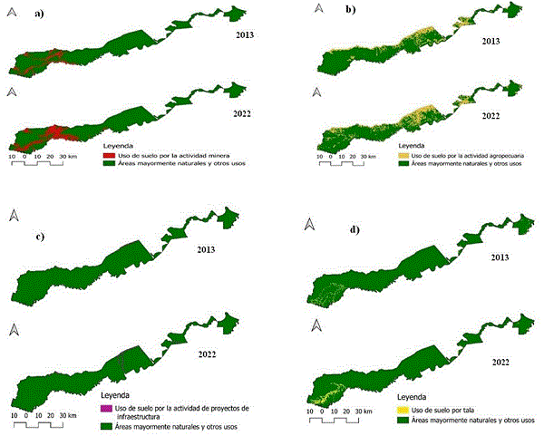 En las Figuras 6 y 7 se observan las cartografías de cambios en la cobertura forestal de 2013 a 2022 de las clases establecidas (minería, agropecuaria, proyectos de infraestructura y tala). Las actividades que generaron cambios significativos fueron la minera y la agropecuaria.