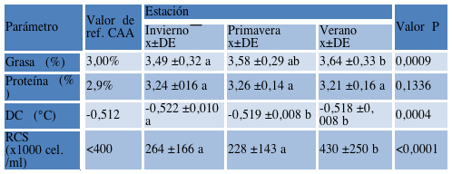 Valores medios para los parámetros grasa, proteína, descenso crioscópico (DC) y recuento de células somáticas (RCS) según estación del año. Letras diferentes entre filas indican diferencias estadísticamente significativas bajo el test de Tukey con un nivel de confianza del 95%.