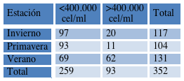 Tabla de contingencia que ubica el número muestras según la estación del año en las que el RCS resulto superior o inferior al valor de referencia.