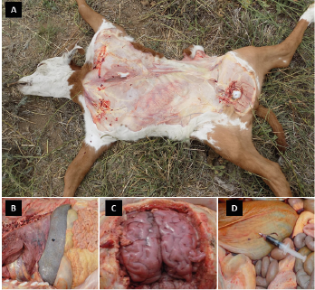 Los dos terneros y las dos vacas en E2 fueron sometidos a necropsia, colectándose muestras de órganos para estudios histopatológicos, extendidos de sangre y de corteza cerebral para exámenes parasitológicos y tejidos para estudios moleculares.