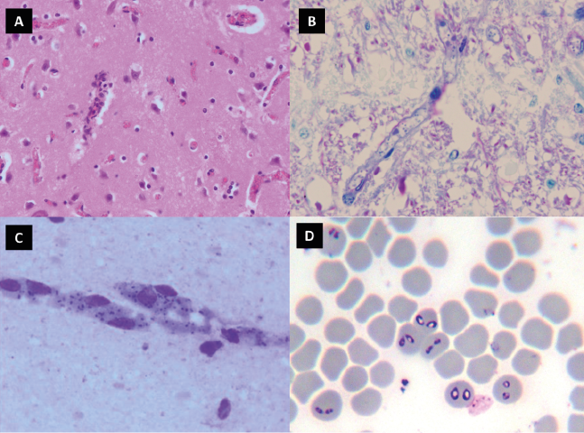Ternero de 15 días (del establecimiento E2) A- Encéfalo, congestión de los capilares de la corteza cerebral (20x, H&E). B- Congestión de los capilares de la corteza cerebral con numerosos eritrocitos parasitados por Babesia bovis (azul oscuro) (40x, Giemsa) C- Extendido de corteza cerebral con abundante presencia de Babesia bovis. D- Extendido de sangre periférica con eritrocitos parasitados con estructuras intraeritrocitarias compatibles morfológicamente con Babesia bovis (100x, Giemsa).