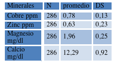 El promedio general de los muestreos relativos al magnesio y calcio séricos fueron normales como se presenta en la tabla 3, coincidiendo con las encuestas caprinas de otras regiones de Salta (Suarez et al., 2015; 2017), aunque diferenciándose de otras en las quebradas áridas donde los valores de calcio fueron bajos (7,25 ±2,25 mg/dl, Suarez et al., 2016).