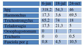 Los hpg observados fueron en general bajos, decreciendo desde finales de otoño hacia la primavera. A partir de estos resultados se podría inferir que la mayor infestación se registraría al inicio del otoño cuando el desarrollo de los NGI se vería favorecido por las lluvias estivales. A pesar de que los muestreos de heces no mostraron los niveles de infestación descritos en las explotaciones comerciales de los valles templados de altura de Salta y Jujuy (Suarez et al., 2017c), las principales especies presentes coincidieron con las de esa región. En otros muestreos en otras regiones áridas también se observó la presencia en bajo número de los géneros Trichostrongylus spp. y de Haemonchus spp. (Suarez et al., 2018)