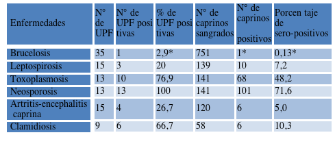 Resultados de los serodiagnósticos frente a las diferentes enfermedades. Número de unidades productivas familiares (UPF) estudiadas, número y porcentaje de UPF positivas, número de caprinos sangrados y número y porcentaje de positivos. *Referido a un suero de diagnóstico dudoso.