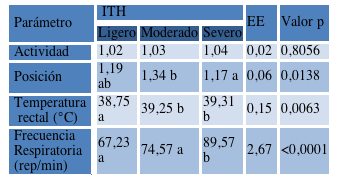 En la tabla 1 se presentan los resultados obtenidos en las variables de la conducta y fisiológicas en función a la severidad del estrés por calor al que se encontraron expuestos los animales.