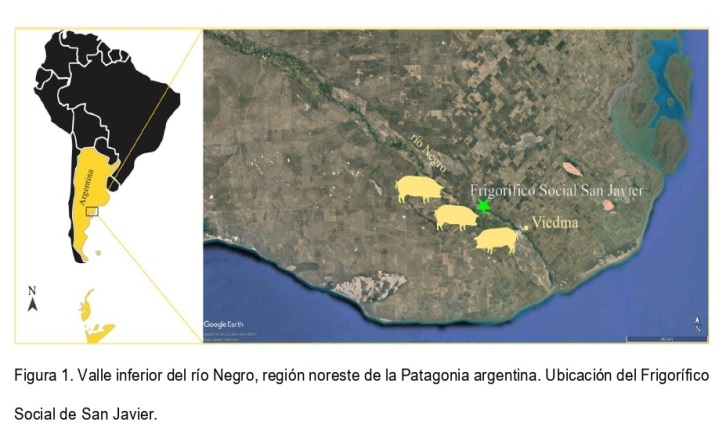 En el valle inferior del río Negro, noreste de la Patagonia argentina, el ecosistema natural se encuentra fragmentado por sistemas agrícolas y ganaderos que conforman en conjunto un paisaje heterogéneo. Los sistemas de producción porcina presentan un nivel tecnológico de bajo a medio, al igual que el 78% de la producción de cerdos en la provincia de Río Negro (Villegas Nigra y Miñón, 2018). Desde el año 2017 el funcionamiento del Matadero Social de San Javier ha permitido a productores acceder a una faena segura que brinde además garantías al consumidor, y cerrar la cadena productiva con la comercialización de la carne en las localidades de San Javier y Viedma. El establecimiento fue concebido como un proyecto social, cuyos beneficiarios directos fueron los pequeños productores. El objetivo del presente trabajo fue evaluar la presencia de larvas L1 de Trichinella spp. en porcinos domésticos procedentes de criaderos de pequeña y mediana escala, en el valle inferior del río Negro, Patagonia noreste de Argentina.