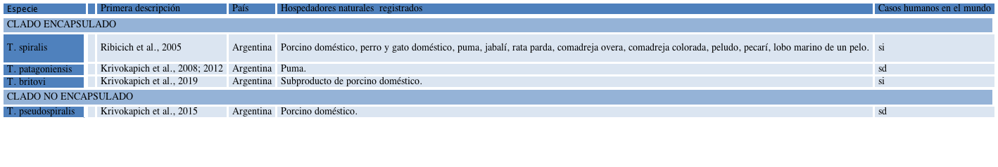 Trichinella spiralis se encuentra dentro de los diez primeros parásitos transmitidos por alimentos de acuerdo a la Food and Agricultural Organization of the United Nations (FAO, 2014). A pesar de que se ha registrado un aumento en el número de casos de triqui-nelosis por consumo de especies cinegéticas, la carne de porcinos domésticos y sus subproductos aún se consideran la principal fuente de Trichinella spp. (Murrell y Pozio, 2011). Hasta el presente, en América del Sur, se han hallado y registrado cuatro especies: T. spiralis, T. patagoniensis, T. britovi y T. pseudospiralis (Krivokapich et al., 2012, 2015, 2019) (Tabla 1), tres de las cuales han sido halladas en cerdos domésticos y productos porcinos en Argentina. Mientras que T. patagoniensis es la única especie endémica hallada en la región Neotropical con registros, hasta el momento, solo en pumas (Puma concolor) (Krivokapich et al., 2012).
