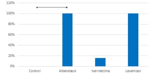 Por otro lado, si bien solo se observaron diferencias significativas en la reducción de recuentos de HPG entre el grupo control y aquel tratado con albendazol, la reducción en los grupos tratados con albendazol y levamisol fue de 100%, con lo cual queda demostrada la eficacia de dichos fármacos para el tratamiento de la GEV en los animales estudiados. Este resultado es de gran importancia ya que, actualmente, las únicas presentaciones comerciales de antihelmínticos para uso exclusivo en pequeños rumiantes aprobadas por SENASA son las que contienen estos grupos químicos (imidazotiazoles y benzimidazoles) (Anziani y Fiel, 2015).