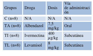 Los animales fueron pesados y posteriormente distri-buidos de manera aleatoria para conformar 4 grupos de 8 animales cada uno: Control sin Tratamiento (C); Tratamiento con Albendazol (TA); Tratamiento con Ivermectina (TI) y Tratamiento con Levamisol (TL).