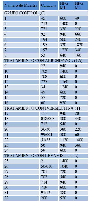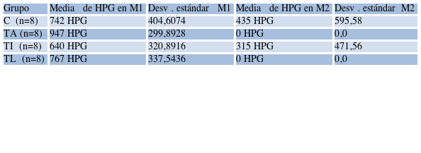 La Tabla 2 reúne los valores de HPG que presentaban los animales en estudio en el M1 y M2. Las medias aritméticas y los desvíos estándar de los recuentos de HPG para cada grupo tratado y del grupo control en el M1 y M2 se encuentran en la Tabla 3.