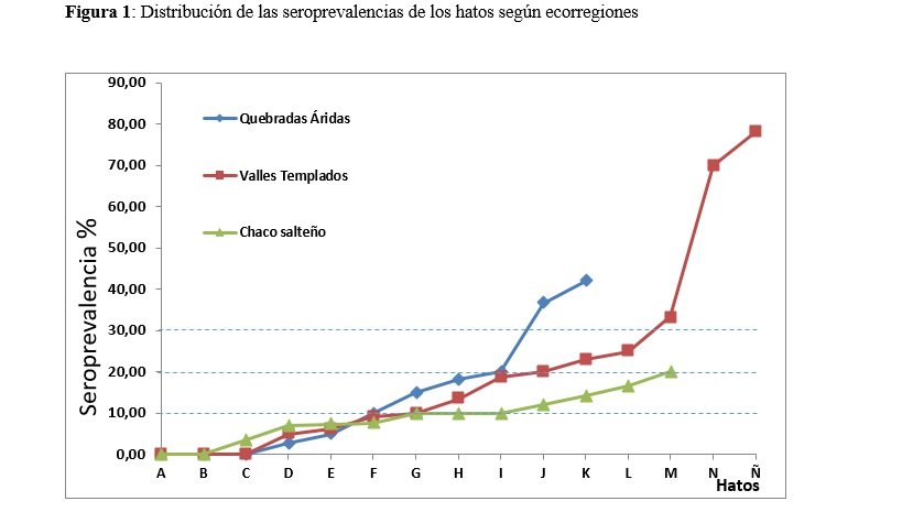 Resumen: La toxoplasmosis, causada por Toxoplasma gondii, es una zoonosis que produce pérdidas reproductivas en rumiantes. Este trabajo caracterizó la presencia indirecta, a través de anticuerpos, de la enfermedad en caprinos de la provincia de Salta a través de una encuesta en 39 unidades productoras (UP). Se tomaron muestras biológicas para el diagnóstico de enfermedades en la que fue incluida toxoplasmosis. En un análisis el promedio provincial de UP con animales positivos fue del 79,49% y la seroprevalencia media de los hatos fue 19,09% con valores entre 2,8 y 78,13% siendo más frecuentes valores menores del 20%. Se detectaron UP positivas en toda la provincia con los siguientes promedios de UP con animales positivos: Chaco Salteño (CS)=84,62%, Quebradas Áridas (QA)=72,72%, Valles Templados (VT)=80,00%. La seroprevalencia en los hatos osciló entre CS=3,50-20,00%, QA=2,80-42,00% y VT=6,25-78,13%, encontrándose anticuerpos contra T. gondii presentes en todas ecorregiones evaluadas de la provincia de Salta.