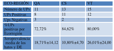 El 79,49% de las UP fueron positivas (treinta y una), mientras que sólo el 20,51% de las UP resultaron negativas (ocho de ellas). La prevalencia serológica global de la provincia (porcentaje de animales positivos /animales totales) fue de 16,28%, mientras que la seroprevalencia media de los hatos (promedio del porcentaje de animales positivos por hato) fue de 19,09% ± 17,92. Se detectaron establecimientos positivos en todas las ecorregiones presentando un promedio de UPs con animales positivos con los siguientes valores CS=84,62%, QA= 72,72%, VT= 80,00%. Los resultados de las seroprevalencias medias de los hatos por ecorregiones fueron CS=10,80% ±4,70 QA= 18,71±14,12 VT= 26,01% ±24,00 los mismos que se resumen en la Tabla 1 y en la Figura 1.