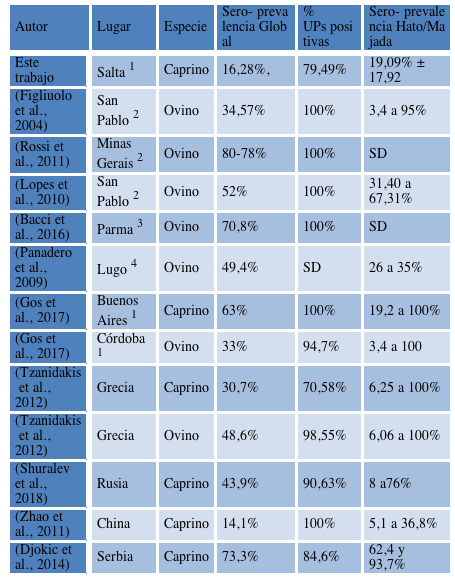 Se detectaron anticuerpos anti T. gondii ampliamente distribuidos en la provincia. El promedio de UPs positivas fue de 79,49%, el resultado alto y cercano al 100%, se condice a que la mayor parte de las explotaciones poseían al menos un animal positivo, este dato es concordante con la bibliografía consultada que esta resumida en la Tabla 2, donde su porcentaje varía entre 70 y 100% (Bacci et al., 2016; Djokic et al., 2014; Figliuolo et al., 2004; Gos et al., 2017; Lopes et al., 2010; Panadero et al., 2009; Rossi et al., 2011; Shuralev et al., 2018; Tzanidakis et al., 2012; Zhao et al., 2011). La seroprevalencia global 16,28% fue baja y menor que los trabajos de Rossi (2011), DJokic (2014), Bacci (2016), Gos (2017) en Buenos Aires, Lopes (2010), Panadero (2009) y Shuralev (2018). Se asemeja a los de Zhao (2011). Mientras que resultado medio de los hatos fue de 19,09% ± 17,92, mostrando una gran dispersión que concuerda con la mayor parte de los trabajos citados, situación que hace pensar que existen factores particulares de cada grupo de animales que hace que en ese lugar exista mayor cantidad de seropositivos mientras que en otros no sedaría esa coyuntura.
