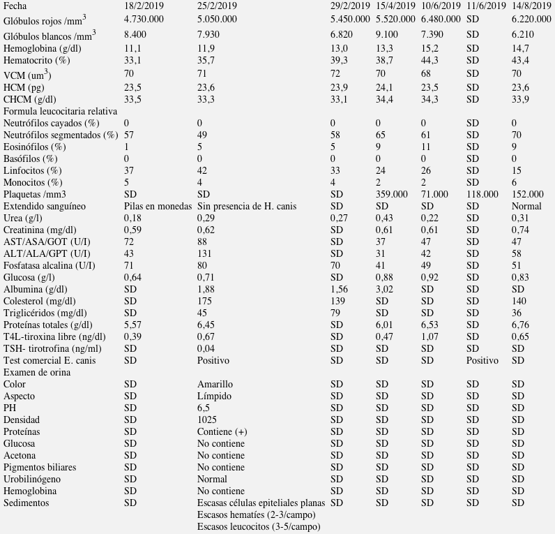 El día 15/04/2019 se realiza control clínico del paciente, corroborándose que la mascota recupero su peso normal en 60 días. Se realiza hemograma completo de control, arrojando valores normales con leve aumento de eosinófilos (9%). Recuento plaquetario y enzimas hepáticas normales (Tabla 1).