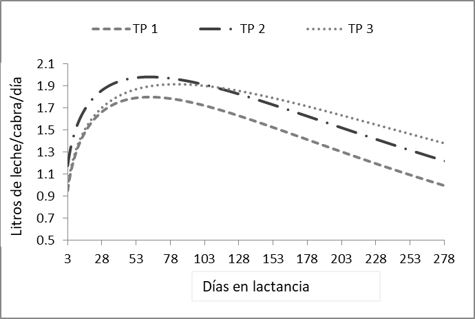 Curva de lactancia en función al tipo de parto de las cabras TP 1: parto simple; TP 2: parto doble; TP 3: parto triple.