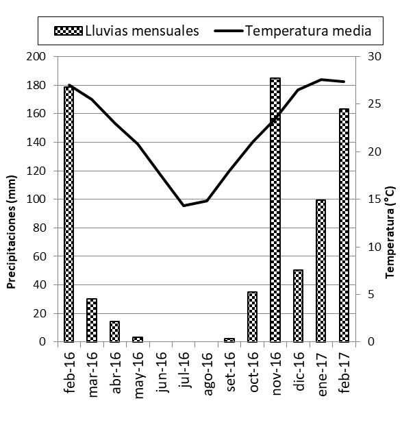Las temperaturas medias y precipitaciones mensuales acontecidas durante el ensayo se muestran en la Figura 1. Las precipitaciones mensuales que se registraron sumaron 566 mm,
