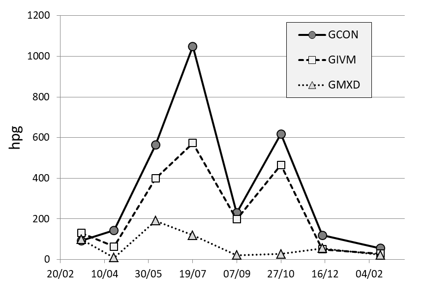 El grupo GMXD siempre tuvo valores de hpg muy bajos, la eficacia de la MXD fue 93,5% con eficacias de 76% y 98% contra Cooperia spp. y Haemonchus spp.respec-tivamente.