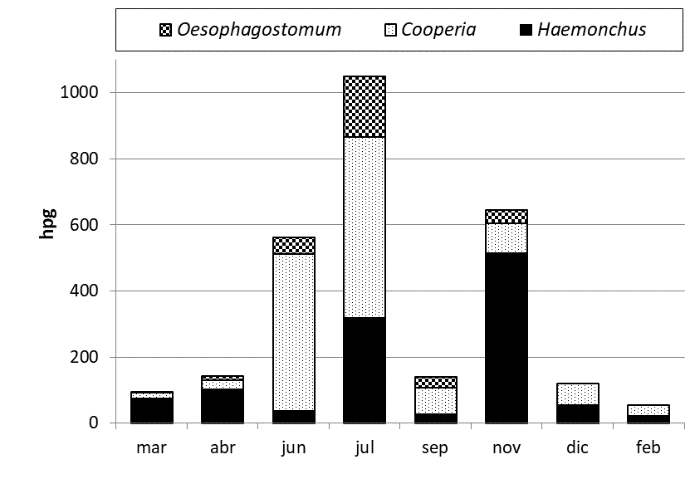 El descenso de los hpg del GCON a fines del invierno, probablemente se deba en parte a la consolidación de la inmunidad frente a Cooperia y en parte a la mortalidad y pobre disponibilidad de larvas en las pasturas debido a la falta de lluvias y sequedad ambiental (Suarez, 2001). Este descenso del hpg se vio interrumpido a mediados de primavera por una abrupta elevación, probablemente debida a la traslación al pasto de las larvas como consecuencia de las lluvias a partir de octubre, aunque en este caso el género predominante fue Haemonchus. Finalmente, los hpg descendieron hacia el verano en las terneras ya con más de un año de vida y con la adquisición de inmunidad (Suarez et al., 1999).