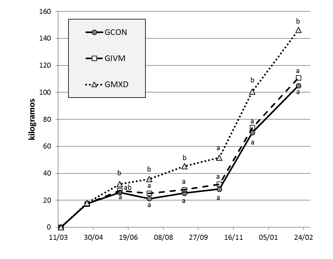 Los pesos iniciales de los grupos de terneras no mostraron diferencias (p<0,37), siendo de 145,8, 146,1 y 141,1 kg respectivamente para GCON, GIVM y GMXD. El promedio en la GPV de los grupos se grafica en la Figura 4. El efecto de los tratamientos se evidenció desde fines de otoño, mostrando el GMXD al final del invierno una mayor GPV (p<0,04) que la de los otros dos grupos con 20 y 17,5 kg a favor del GMXD respecto al GCON y GIVM. Las GPV del GMXD, GIVM y GCON fueron de 45,4 kg, 27,9 kg y 25,4 kg respectivamente.