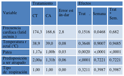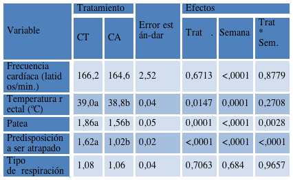 En función a los datos obtenidos en el presente ensayo en la etapa de lactantes (Tabla 1) no se observaron diferencias estadísticamente significativas a nivel de frecuencia cardíaca (CT: 166,20 vs CA: 164,28), mientras que si se detectaron en lo que refiere a temperatura rectal (CT: 38,99a vs CA: 38,83b) cabe mencionar que estas diferencias se debieron al efecto de la semana de muestreo y no al tipo de crianza. A su vez durante la etapa de recría (Tabla 2) no se detectaron diferencias significativas para ninguno de los parámetros antes mencionados (Frecuencia cardíaca: CT: 174,31 vs CA: 168,56 - Temperatura rectal: CT: 38,92 vs CA: 39,02). Al considerar los valores promedios relevados de ambos parámetros y en las dos etapas de ensayo es posible concluir que en todas las instancias evaluadas éstos se encontraron dentro de lo considerado como normal para la especie y la edad, por lo que la presencia de los seres humanos con una frecuencia semanal en el grupo CT no alteraría los parámetros fisiológicos relativos a frecuencia cardíaca y temperatura rectal.