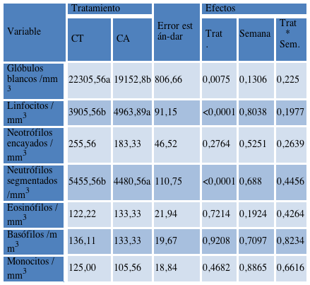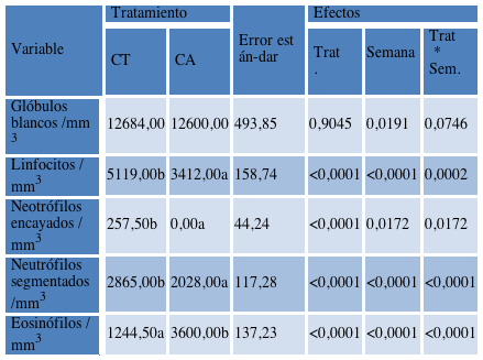Resultados del leucograma de los animales durante la etapa de recría. Letras diferentes en fila representan diferencias significativas (α=0,05). Tamaño muestral= 80.