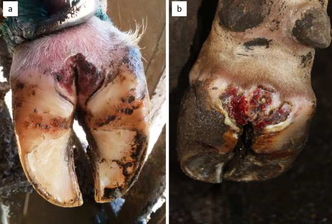 a- Lesión temprana, erosiva, digital de la dermatitis localizada en el canto interdigital palmar del miembro posterior b- Lesión de dermatitis digital crónica, proliferativa (papilomatosa) en una posición similar a la anterior.