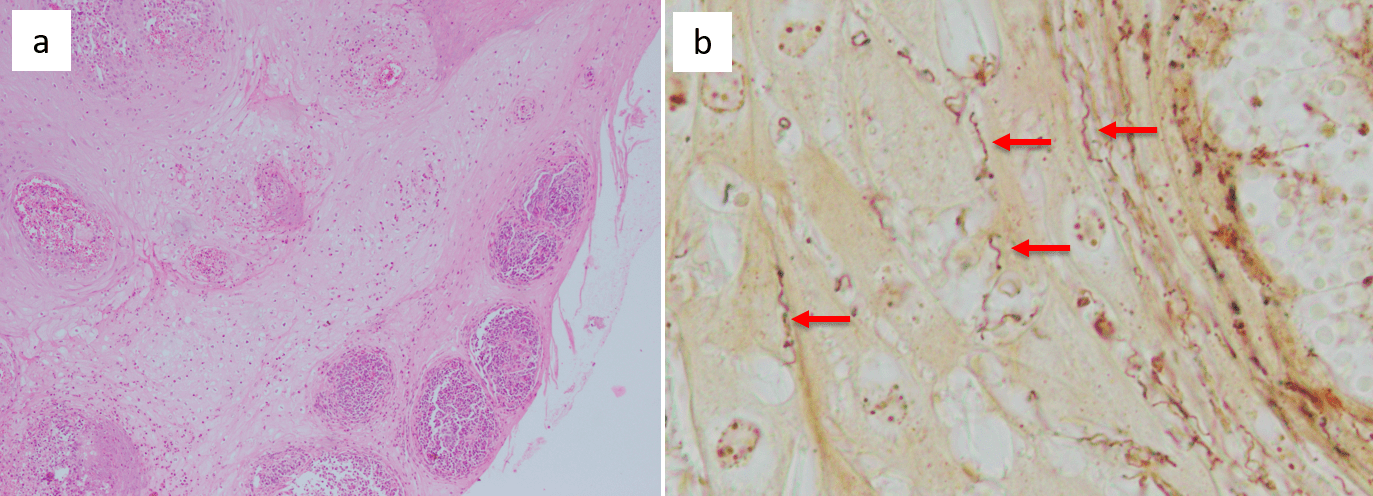a- Lesión histológica caracterizada por infiltración neutrófilica, hiperqueratosis ortoqueratósica y degeneración epidérmica (H&E, 40X). b- Presencia de estructuras compatibles con espiroquetas (flechas) intralesionales (Warthin-Starry, 1000X).