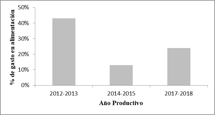 La variación abrupta observada en la Figura 2 se debe a un cambio profesional en el manejo de sistema, en el primer ejercicio (2012-2013) se aplicaba un manejo alimentario basado en una dieta dependiente en gran medida de suplementación, en la cual no se aprovechaba el recurso forrajero tanto por falta de manejo como por deficiencias en planeamiento forrajero; en el segundo ejercicio hay una mayor eficiencia en la producción y aprovechamiento de materia seca generada en el establecimiento y en el tercer año aumenta nuevamente el porcentaje de suplementación de concentrado debido a que aumenta la carga animal y el recurso forrajero que ofrece el establecimiento no es suficiente para cubrir los requerimientos del rodeo. La parte técnica en el ejercicio 2012-2013 estaba a cargo de un Ingeniero Agrónomo contratado, el cual tenía un enfoque en sistemas intensivos y con escaso conocimiento sobre estrategias de pastoreo, se planteaban dietas complicadas al personal generando frustración por falta de tiempo para realizar los trabajos, desgaste de maquinaria y gasto de combustible innecesarios. El rodeo se encontraba con bajo estado corporal, no lográndose las producciones individuales propuestas (menores a 20 L promedio vaca/año), reduciendo la tasa de concepción anual al 28% y generando altos costos por litro producido. En los ciclos siguientes, con el hijo del productor incorporado en la empresa, se modifica el equipo de gestión, ya que al incorporar un profesional más, se cambiaron las estrategias de pastoreo, se ajustaron las dietas ofrecidas al rodeo y se organizaron de manera más simple las actividades a realizar dentro del proceso productivo, identificando los puntos críticos de control para lograr mayor impacto productivo reduciendo la cantidad de actividades diarias sobre el personal, articulando de mejor manera las labores y disminuyendo el gasto de combustible y uso de maquinaria destinada a la alimentación del ganado.