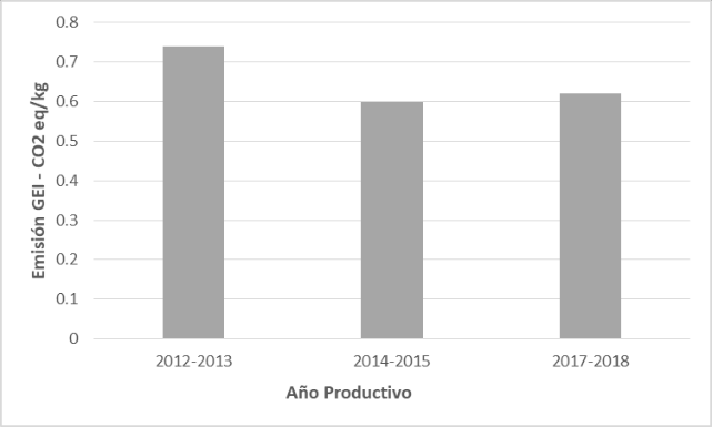 En la Figura 6 se aprecia un descenso en las emisiones de GEI desde los 0,76 kg CO2 eq/kg leche corregidos del ciclo 2012-13, hasta situarse en el orden de 0,6 kg kg CO2 eq/kg leche corregidos en los ejercicios posteriores. Dada la expresión del indicador, en cantidades de gases con relación a la producción lechera, es factible proponer que el descenso en las emisiones se vincula con el incremento de la productividad del sistema. La exigua diferencia entre los ejercicios 2014-15 y 2017-18 puede relacionarse con el incremento en la carga animal, dado durante el último ciclo, especialmente teniendo en cuenta que la mayor parte de las emisiones de GEI en los sistemas lecheros se vinculan con los procesos de fermentación entérica del ganado. La herramienta califica como adecuado el nivel de GEI en los últimos dos ejercicios productivos e insuficiente en el primer año productivo analizado.