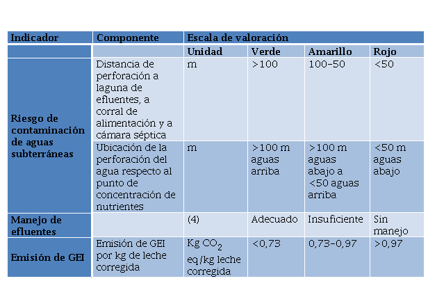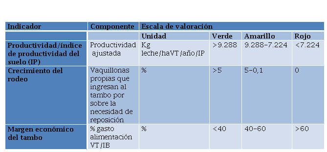 Para la evaluación de la sustentabilidad del sistema se utilizó una herramienta desarrollada por el Programa Nacional de Producción Animal (PNPA 1126043) del Instituto Nacional de Tecnología Agropecuaria (INTA) (Litwin et al., 2016). Los rangos están definidos por por esa herramienta y se le asignó colores para identificar resultados. Deseables: verde, Regulares: amarillo e Indeseables rojo La misma consta de una serie de planillas basadas en Microsoft Excel®, en las cuales recolecta datos del establecimiento (generales, rodeo, producción de leche, instalaciones, manejo alimentario, planteo técnico), que luego son utilizados para calcular el valor de un set de indicadores de sustentabilidad económico-productiva, socio-cultural y ecológico-ambiental. De todos ellos se seleccionaron una cantidad limitada de cada dimensión, a saber: