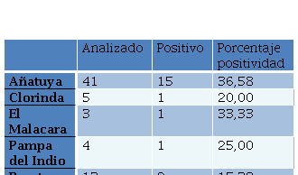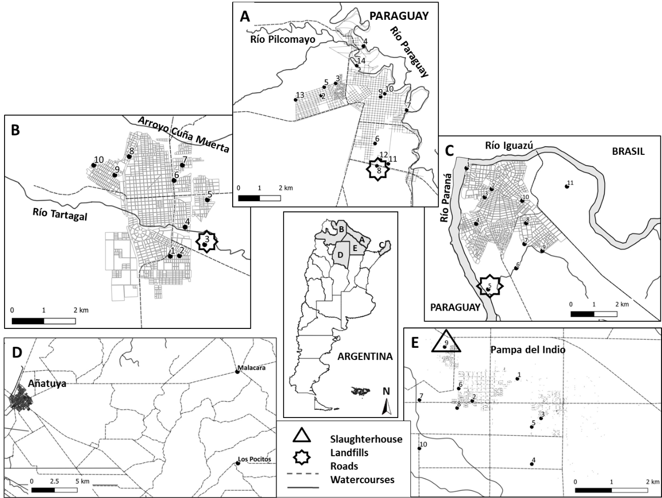 Los resultados positivos obtenidos se resumen en las Tablas 4 y 5. Las muestras que resultaron positivas en El Malacara, Pampa del indio, Puerto Iguazú, Clorinda y Tartagal, son muestras colectadas en basurales o cerca de basurales (<100 metros de distancia), con el consiguiente riesgo de presencia de roedores y caninos. En cambio, las muestras de Añatuya, fueron colectadas de diferentes fuentes de agua para consumo (ya sea humano o animal), incluyendo pozos comunitarios o individuales, agua de lluvia almacenada o represas presentes en las viviendas de los habitantes de la región. Según los datos colectados en terreno, en ambos lotes rurales incluidos en el muestreo, El Malacara y Los Pocitos-Tacañita, se observó presencia de diferentes animales (cabras, gallinas, cerdos, caballos). A su vez, todas las viviendas muestreadas poseían perros (en general, más de uno).