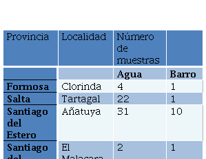 Una vez recibidas en el laboratorio, las mismas se mantuvieron congeladas a -20 °C hasta su procesamiento. Del total de muestras, se seleccionaron 74 aguas y 15 barros para su estudio bacteriológico y molecular (Tabla 1). El presente trabajo es un estudio preliminar, por lo que las muestras fueron seleccionadas en base a los datos recolectados para maximizar las probabilidades de detección bacteriana (ej. presencia de animales, basurales, etc). Las aguas y los barros fueron procesados de distinta forma, según los siguientes protocolos: