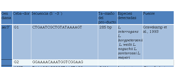 La misma fue diseñada de manera tal de detectar diferencialmente la presencia de material genético de leptospiras de los subgrupos P1 y P2. Para la detección del grupo P1, se amplificó el gen secY mediante el set de cebadores G1/G2 (Gravekamp et al., 1993). En el caso del grupo P2 se amplificó el gen rrs mediante el uso del set de cebadores 16SFw/16SRv, los cuales fueron diseñados de novo utilizando las secuencias disponibles en GenBank (Tabla 2).