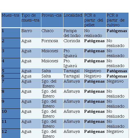 El presente trabajo preliminar demuestra la necesidad de realizar estudios ulteriores respecto a la presencia de este tipo de patógenos en distintas muestras ambientales colectadas en regiones habitadas por poblaciones vulnerables en todo el territorio nacional.