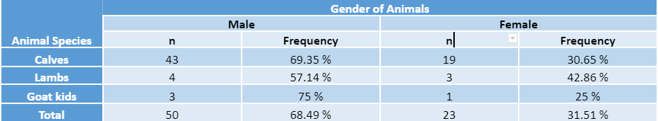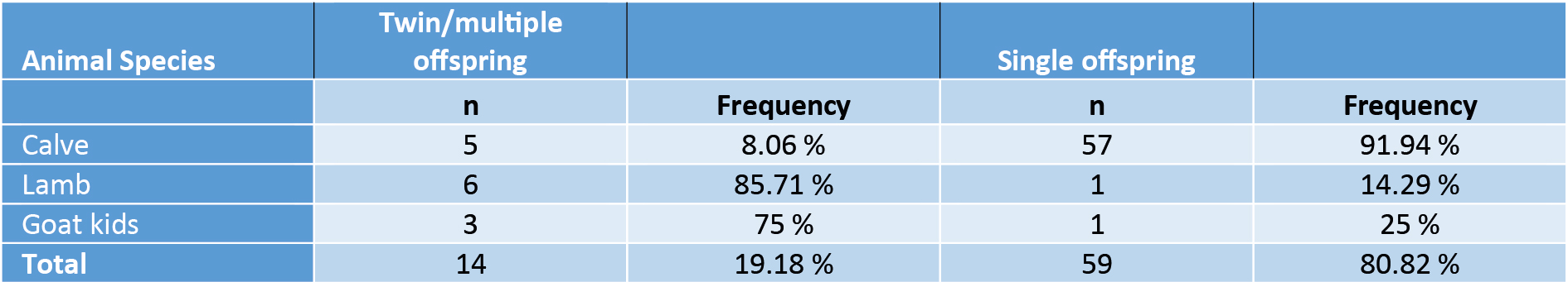 It was found that 19.18% of the animals with congenital anomalies were born as a result of twin (cattle) or multiple pregnancy (small ruminants). ,In small ruminants, the percentage of congenital anomalies was higher in lamb (85.71%) than goatkids (75%) (Table 10).