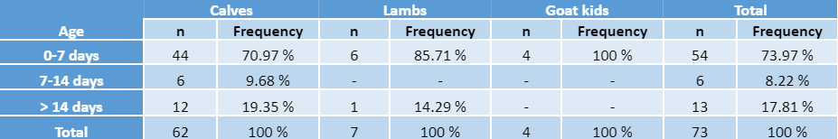 Most of congenital anomalies were detected between 0-7 days old (73.97%), and secondarily when the animals were more than 14 days old (17.81%).The relationship between the age and the presence of congenital anomalies in each animal species is presented in Table 5.